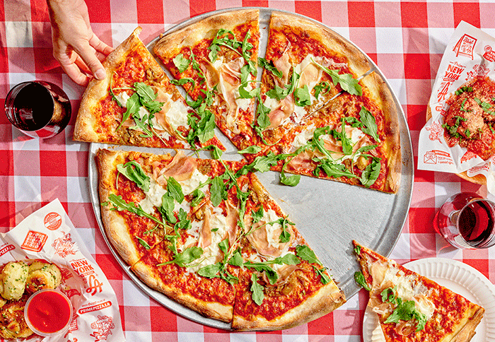 tomato sauce, mozzarella, roasted eggplant, hot cherry peppers, stracciatella, prosciutto, arugula